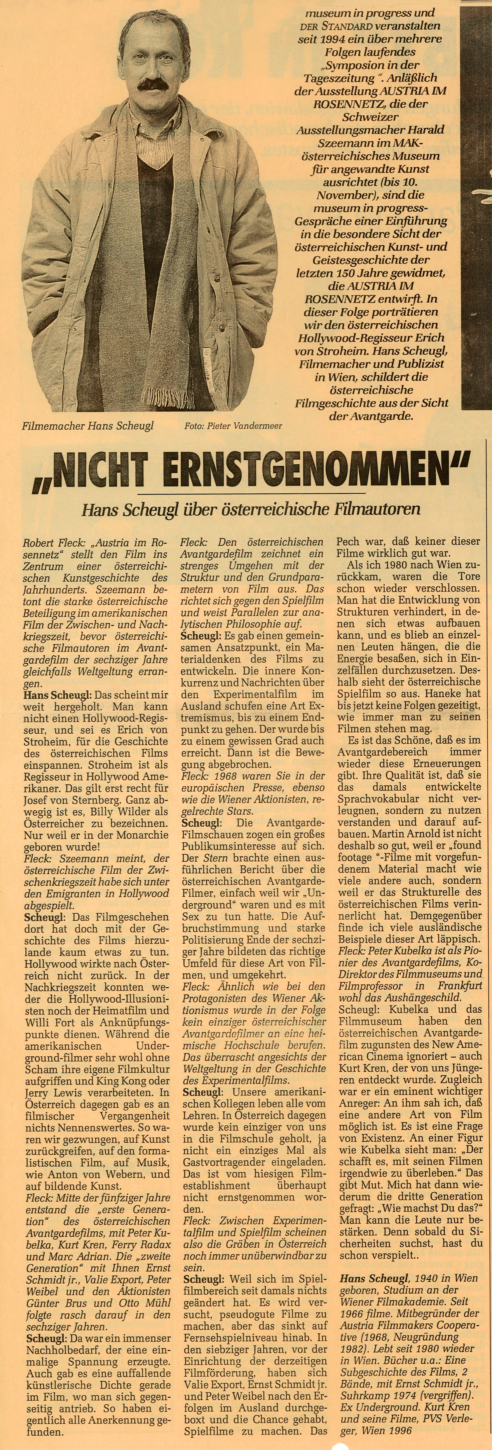 Hans Scheugl: Das scheint mir weit hergeholt. Man kann nicht einen Hollywood-Regisseur, und sei es Erich von Stroheim, für die Geschichte des österreichischen Films einspannen. Stroheim ist als Regisseur in Hollywood Amerikaner. Das gilt erst recht für Joseph von Sternberg. Ganz abwegig ist es, Billy Wilder als Österreicher zu bezeichnen. Nur weil er in der Monarchie geboren wurde!